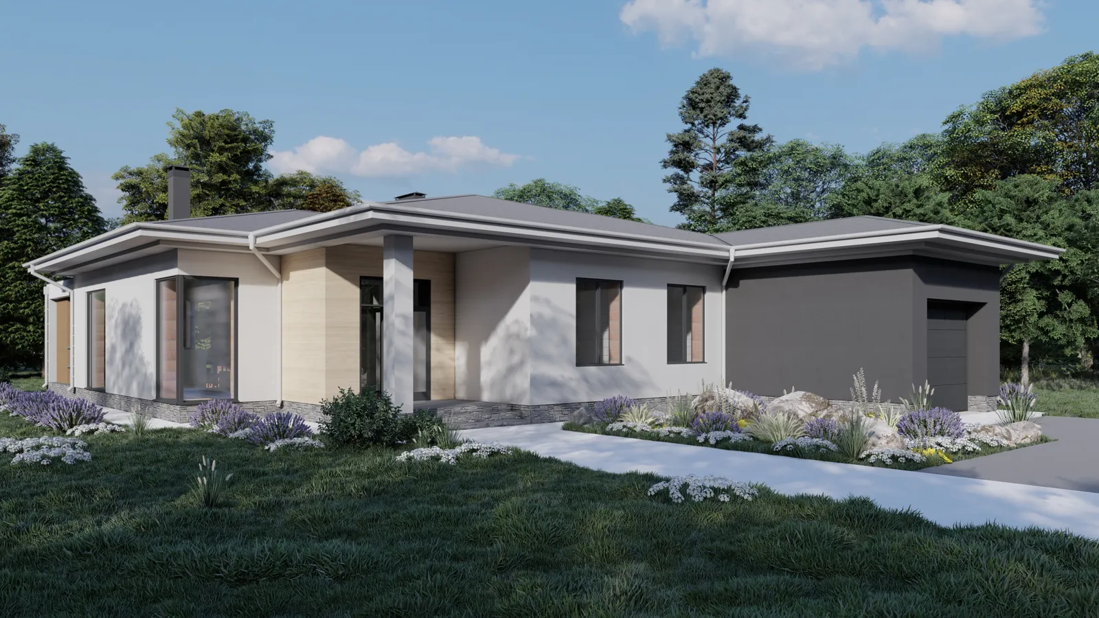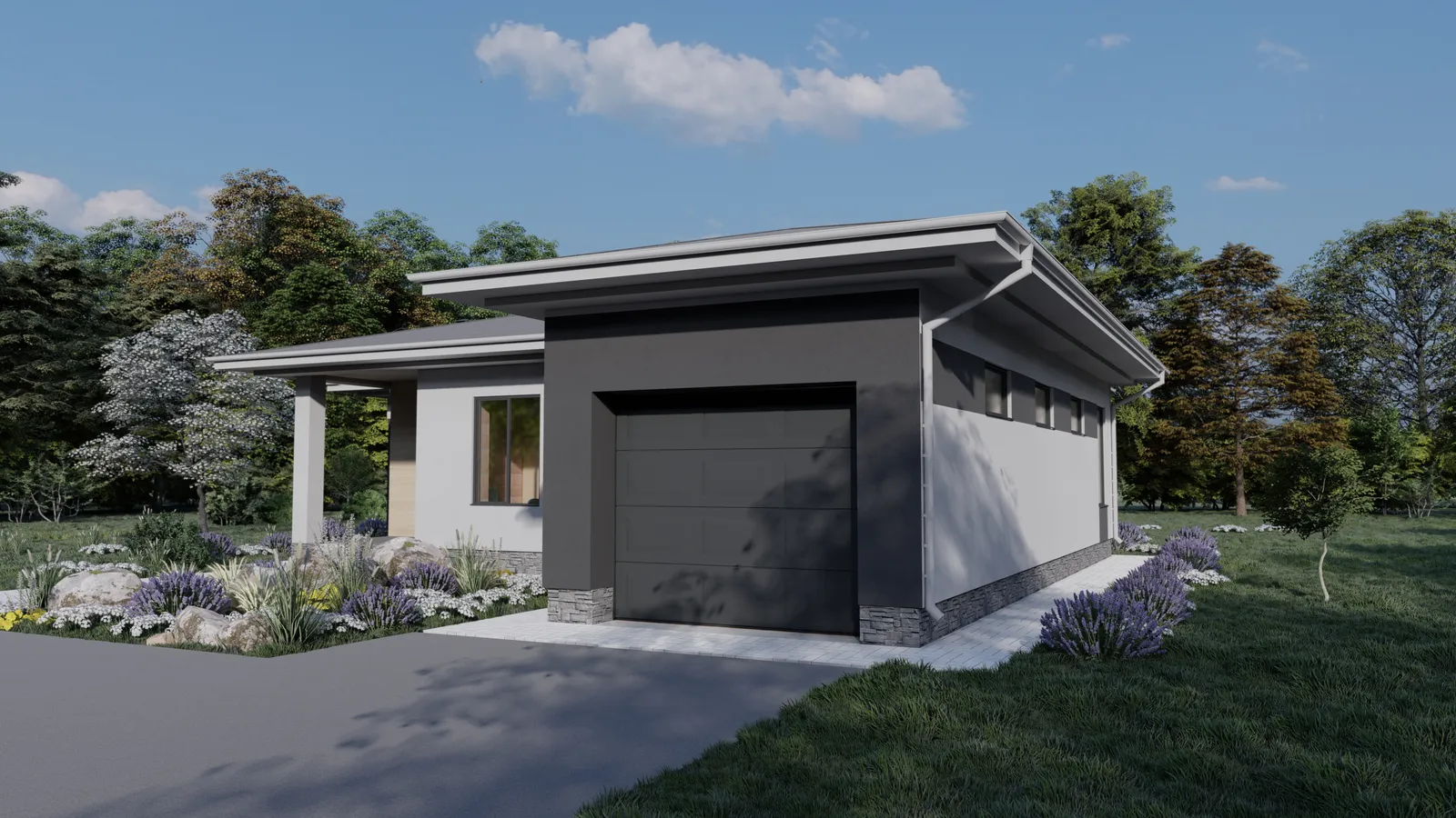 В левой части дома расположен гараж с выходом в котельную, из которой можно попасть на садовый участок.