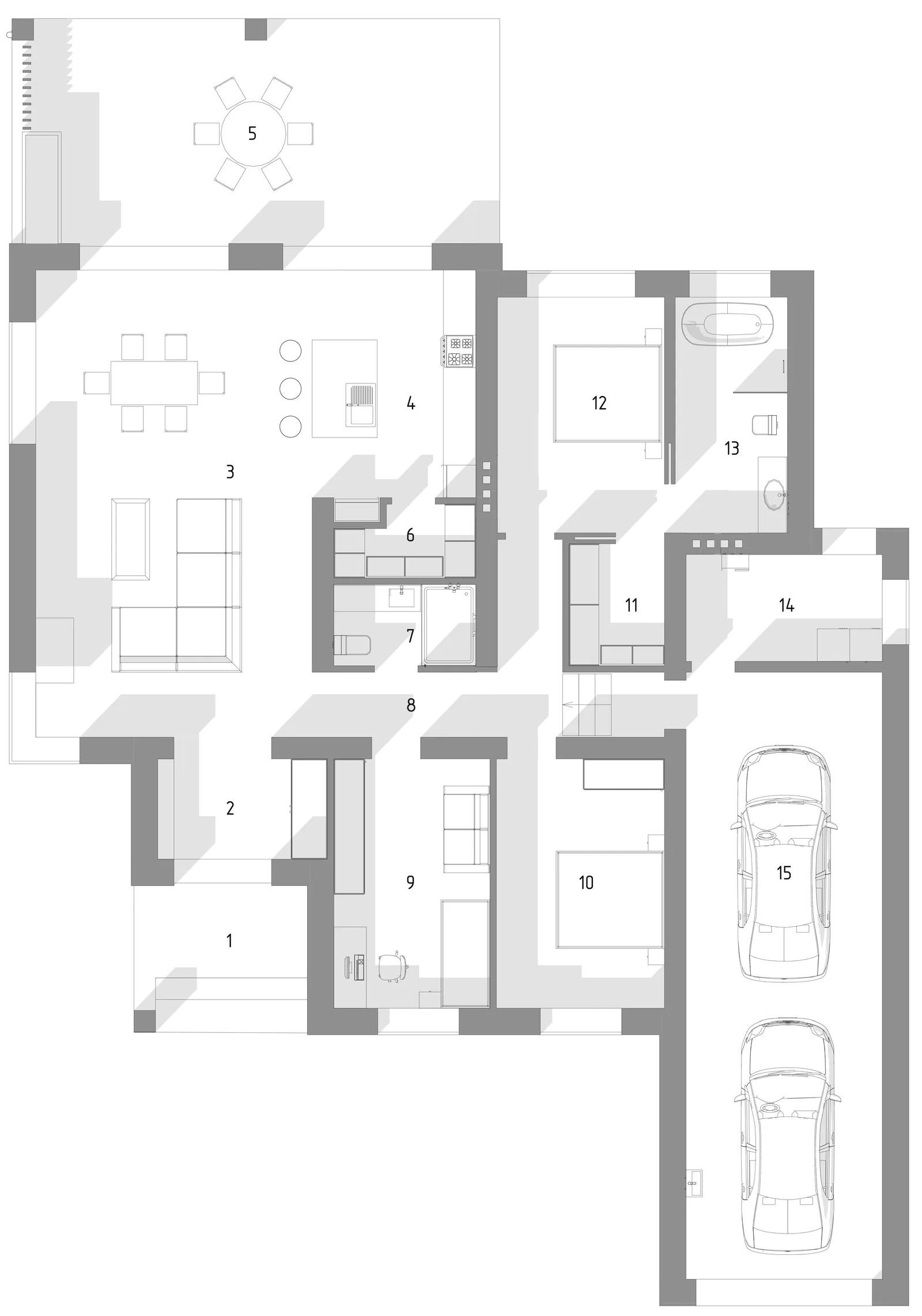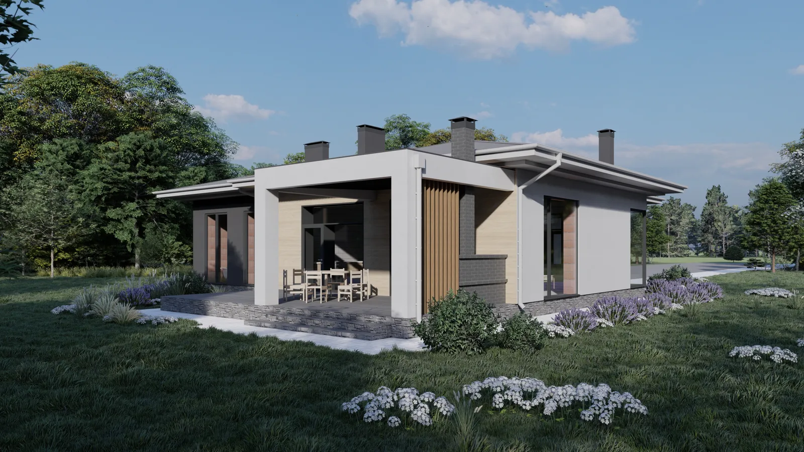 При входе в дом нас встречает холл, из которого мы попадаем в гостиную с большими панорамными окнами и выходом на террасу, рядом с гостиной расположена кухня, которая также имеет отдельный выход на террасу и небольшую кладовую рядом.